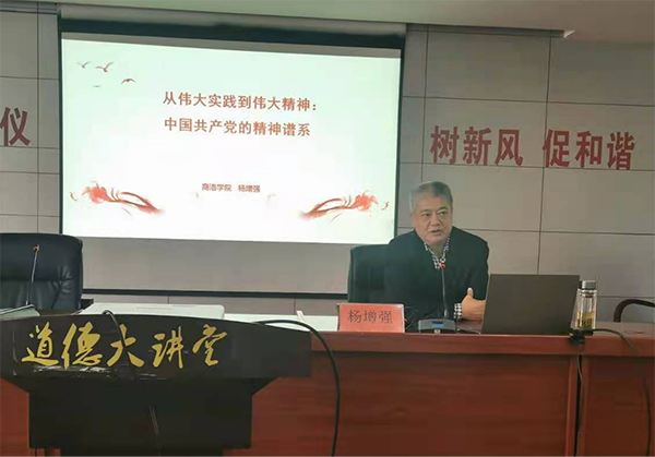 杨增强教授以“从伟大实践到伟大精神:中国共产党的精神谱系”为题,学习以中国共产党的伟大精神为主线,分别通过红船精神、井冈山精神、长征精神、延安精神、大别山精神、抗战精神、西北坡精神、红岩精神、沂蒙精神为大家全面系统回顾了我们党在新民主主义革命时期走过的光辉历程、付出的巨大牺牲、展现的巨大勇气、彰显的巨大力量。