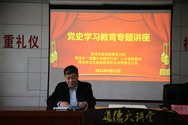 为深入推进党史学习教育活动深入开展,4月13日上午,商洛市建筑勘察设计院联合商洛市“雏鹰计划融创行动”人才实践基地及商洛市文化旅游投资开发有限责任公司邀请商洛学院杨增强教授为全体干部职工作了一场生动的党史学习教育专题辅导讲座。